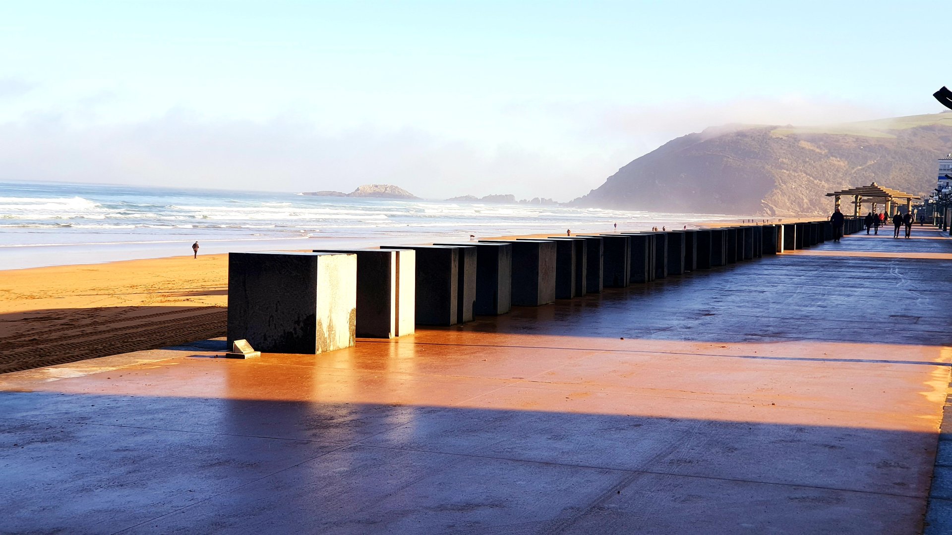Iniciamos la ruta en el paseo marítimo junto a la obra de ‘Elena Asins’, 72 figuras de piedra de un metro cúbico procedentes de Brasil componen esta escultura de 143 metros de largo muy integrada en el paseo marítimo que parte de un cubo completo que va decreciendo y después vuelve a crecer como si de una composición musical se tratara.